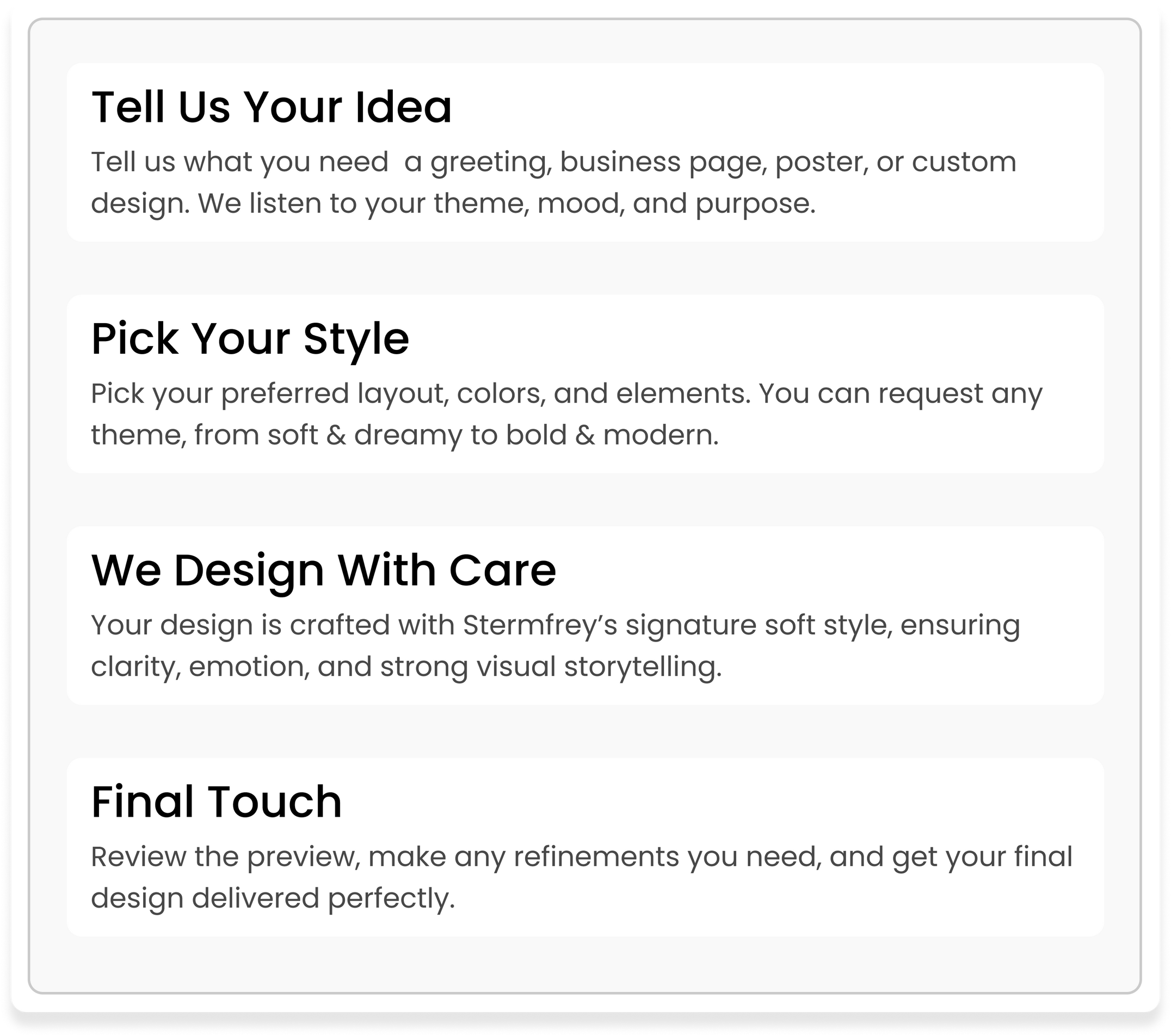 What You Get Inside the GreetingStermfrey greetings are designed as small, meaningful digital experiences.Each card includes 9–12 carefully arranged slides, depending on the elements you choose messages, songs, interactions, photos, video, animations, or playful mini-sections.Every theme can be fully customized to match your story, colors, tone, and personality. Whether it's a sweet birthday note, a romantic anniversary message, or a fun interactive game, the layout adapts to what you want to express.